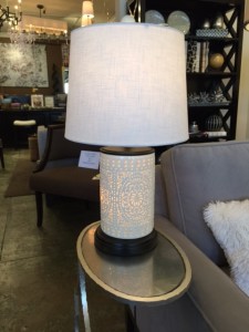 These lamps are so exciting. My clients can’t stop snapping them up. They are white porcelain and pierced with a design all around the base. There is a small light bulb inside the base of the lamp that can be lit on its own or at the same time as the standard bulb at the top of the lamp.