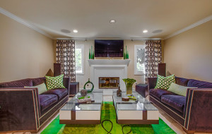 Masculine and colorful contemporary interior design that feature the living room and entryway in Glendale Living.