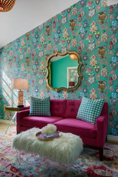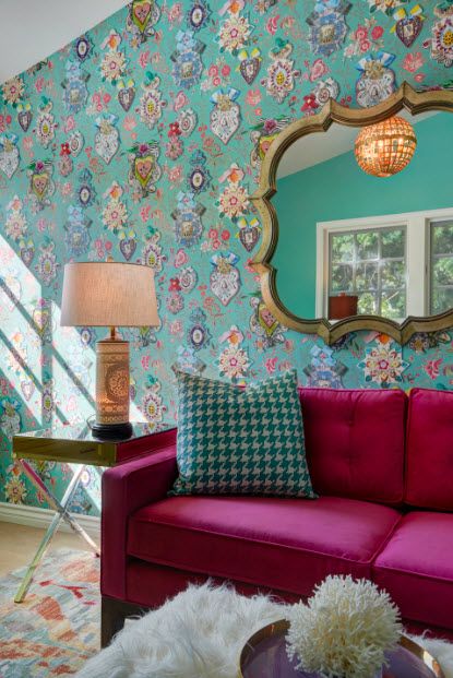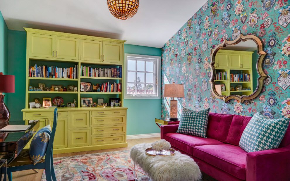 The client can never have enough color in her life. It truly reflects on her furniture choices, patterns and colors for her home office. The busy wallpaper pattern makes a beautiful accent wall against the plain turquoise vignette wall. The bold choice of adding a large citron yellow display cabinets for books and storage surprisingly complemented the busy hues and patterns making it more bright and chic. This particular home office design is the perfect place to hang out and get yourself creative!