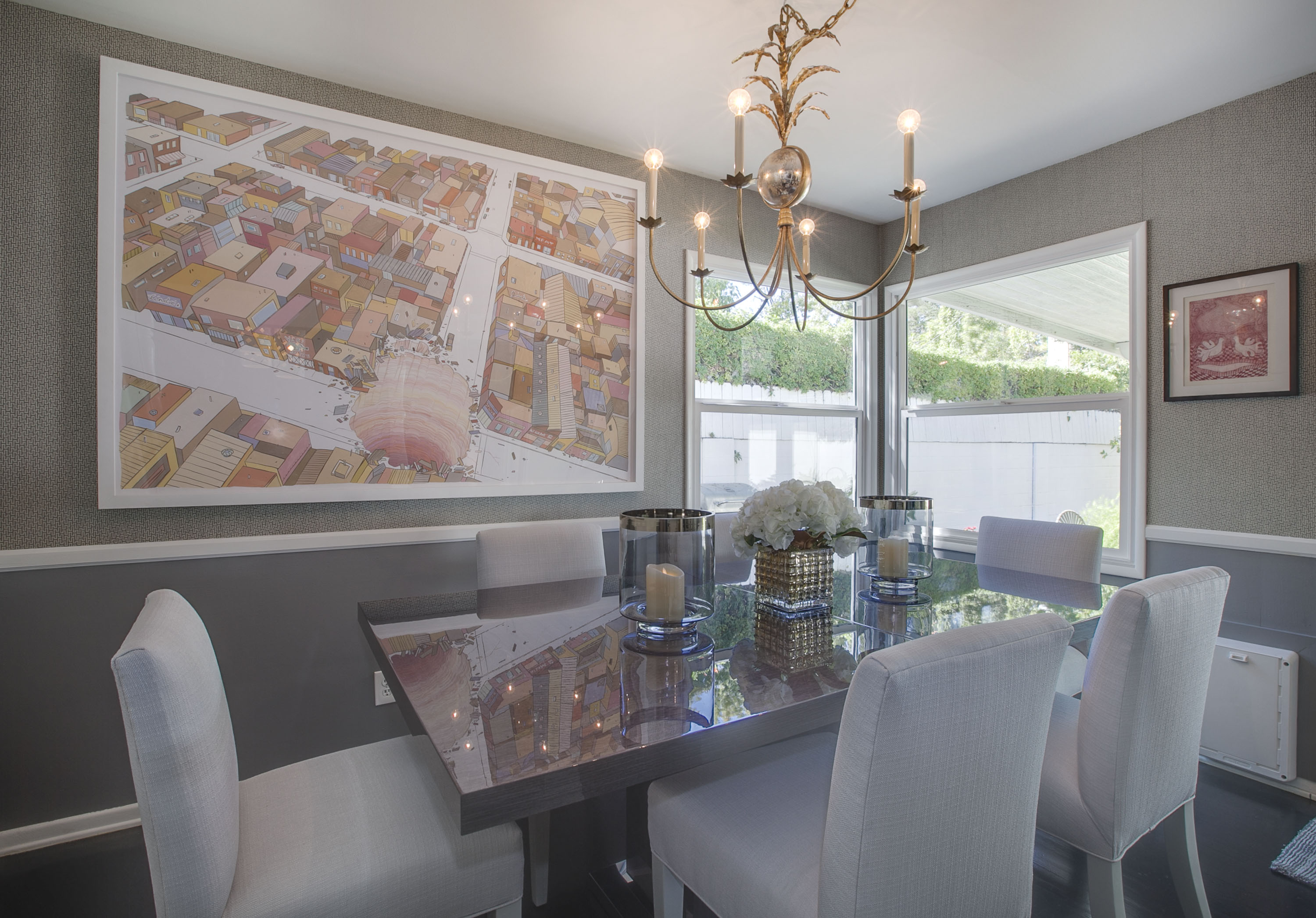 We decided on a sunburst pattern wallpaper for the entry. It is upbeat and welcoming, which is exactly what you want in an entry. Then in the vestibule between the entry and the living room we brought out the built in shelves by leaving them white and painting the walls and backs of the shelves in grey. Then we accessorized the shelves all in black and white, white and gold which set the scene for the color story of the living room just before you enter it. Anytime you have a chair rail or wainscoting in a room, especially a dining room where it is more common, it provides the opportunity to wallpaper the upper half and paint the lower half. It can keep the walls from looking too busy if the wallpaper is a busy pattern. It also makes it more interesting to combine the textures in the one room.